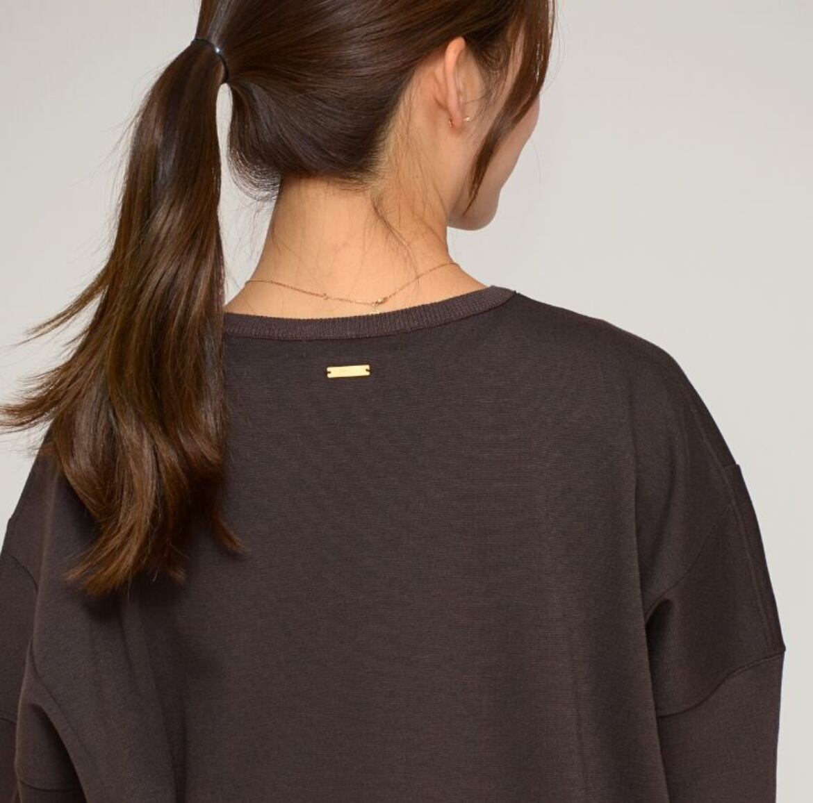 袖先、ネック、裾には本物のニット素材を使用し、上品なハイゲージニットのような見た目を実現。