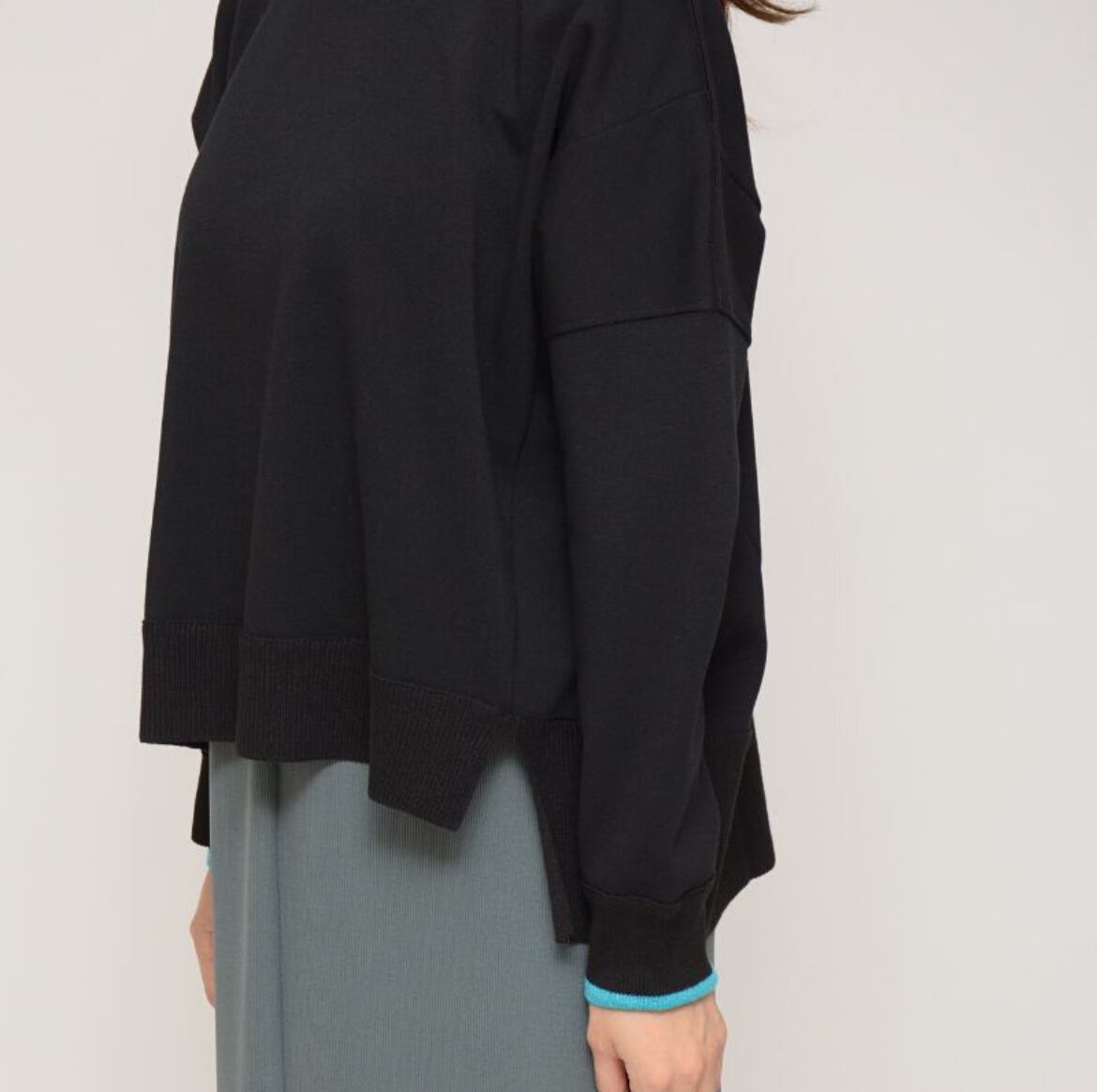 袖先、ネック、裾をニット素材に切り替え、