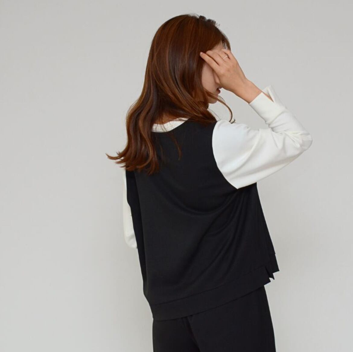 まるでレイヤードしているかのようなスタイルが完成するドッキングトップス。