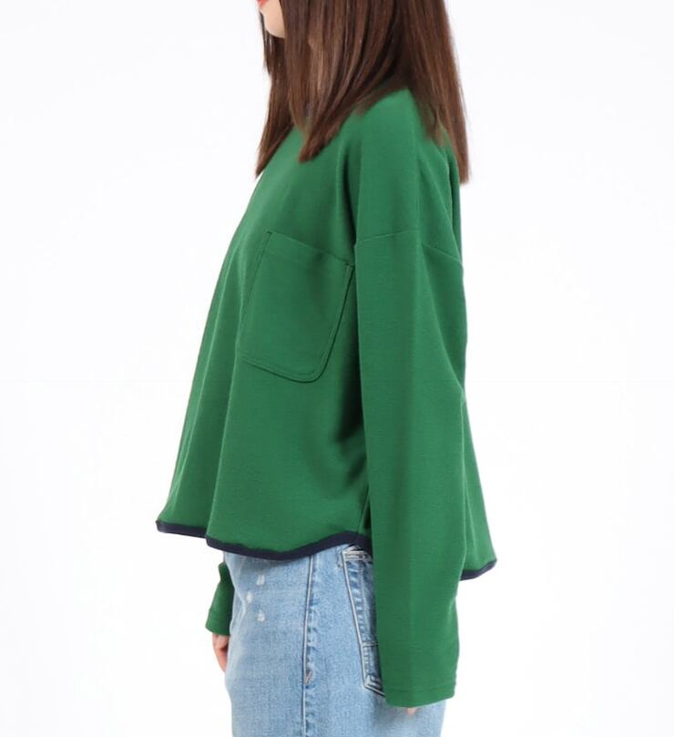 ニットのような凹凸感が特徴のCafetty・T/Cでこぼこ天竺プルオーバー。軽いT/C混素材で、秋から冬のレイヤードにも取り入れやすい一枚です。ワイドなオーバーシルエットにジャスト丈が絶妙で、ハイウエストボトムやシャツ合わせもすっきり決まります。配色パイピングと、同色のカンドメ付き胸ポケットがデザインのアクセントに。シャツやTシャツとのレイヤードも◎。ゆったり着られるのに女性らしさが香る、大人カジュアルにぴったりのトップスです。