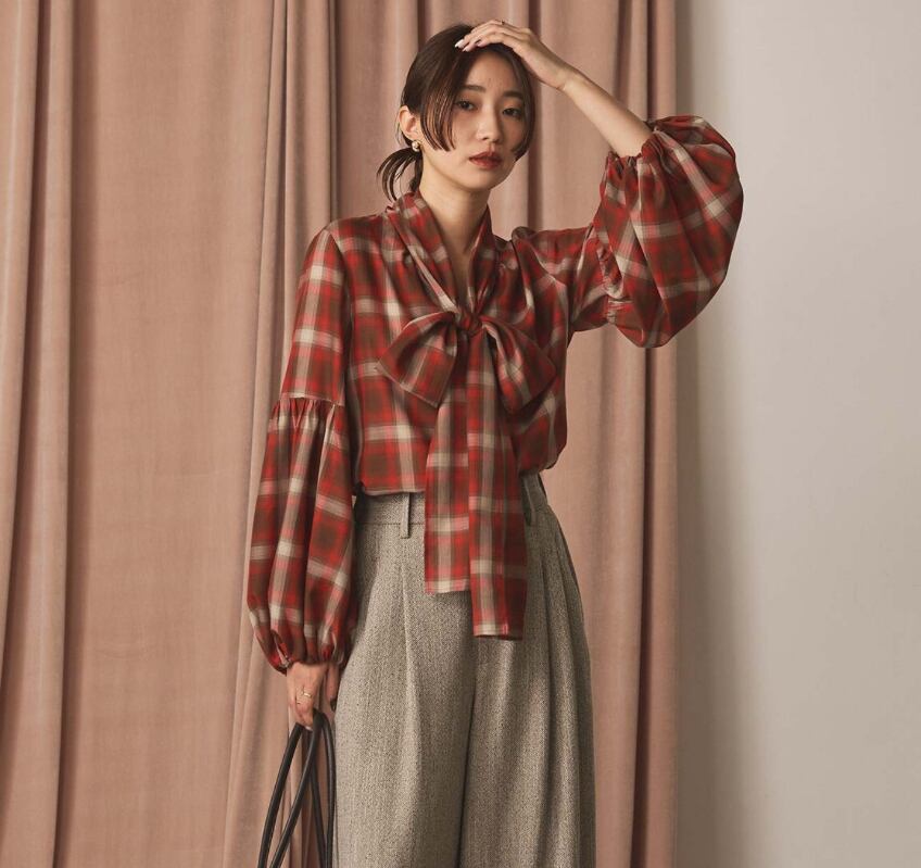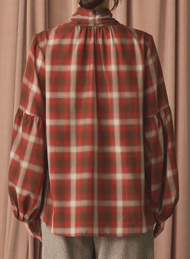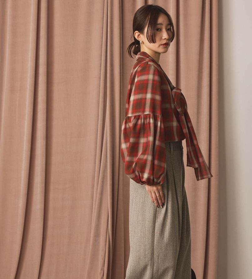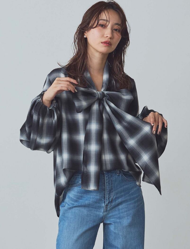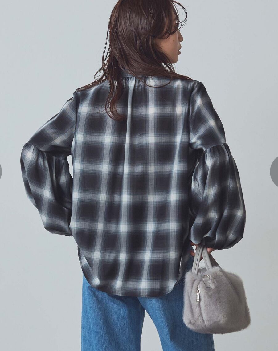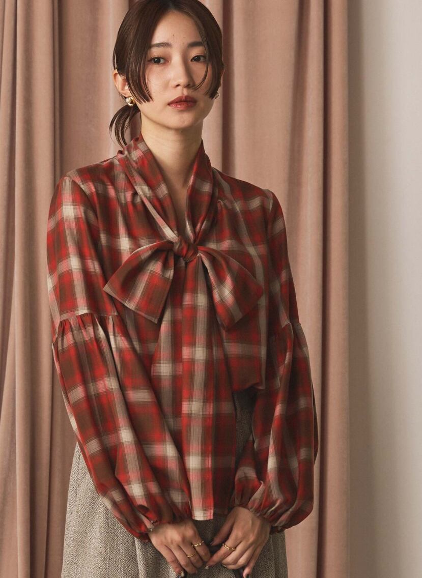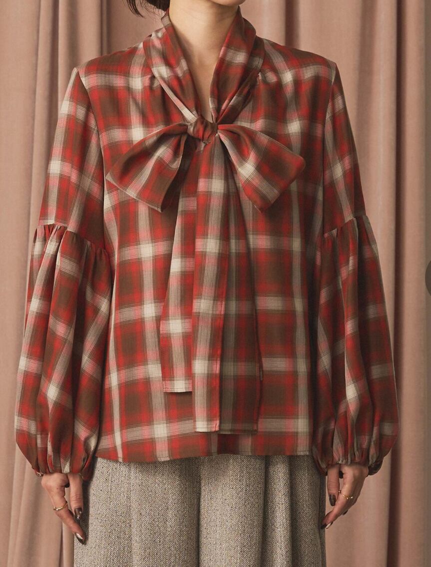 チェックの華やかなボウタイブラウス。 軽やかな風合いが魅力のオンブレチェック生地を使用。繊細な素材感でカジュアル過ぎないので、大人女子が着やすくなっています。 袖口にはゴムが入っており、たっぷりボリュームのパフ袖がポイントです。