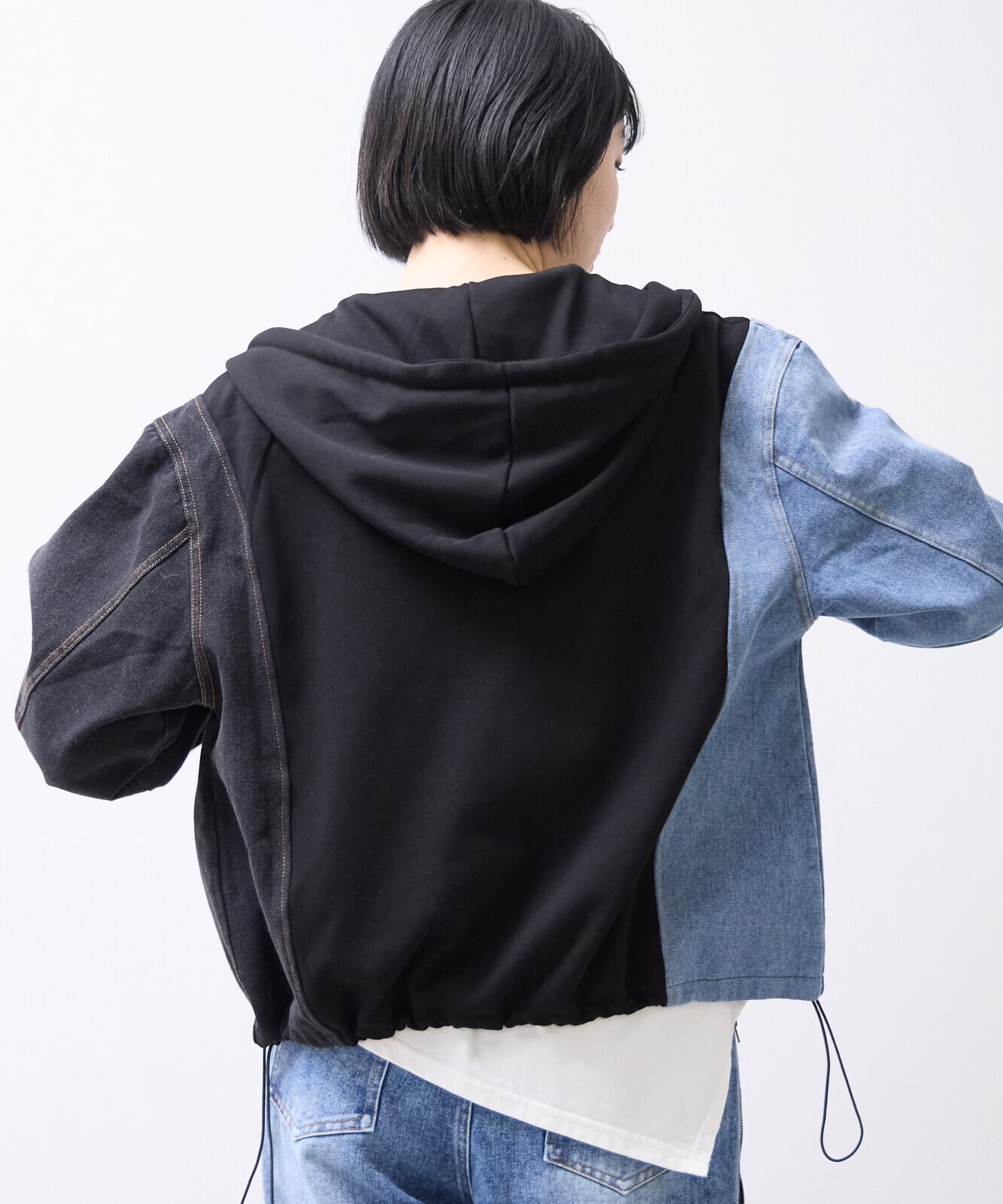 袖とボディサイドは右手はブルーデニム、左手にはブラックデニムを使用しています