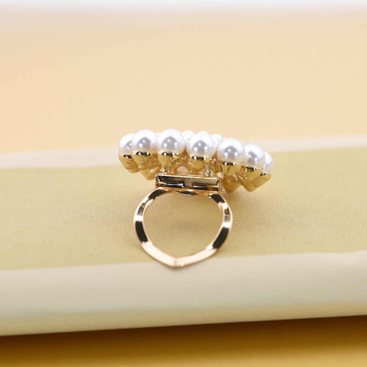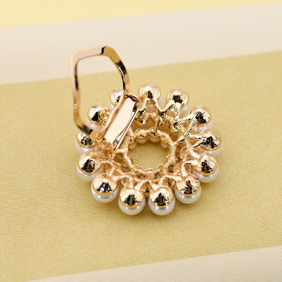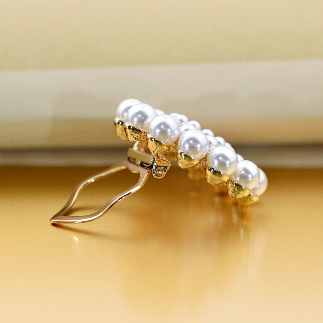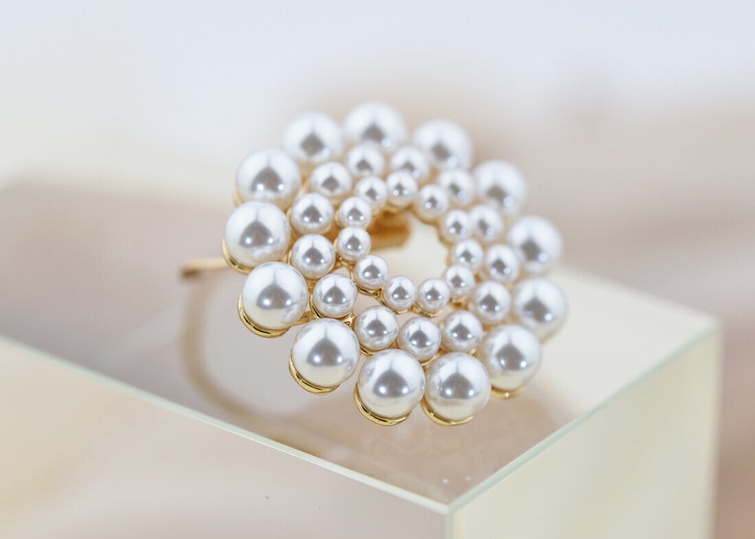 たくさんのパール風ビーズを盛り付け、随所にクリアストーンを散りばめています。リング型のクリップが付いており、スカーフを通して使用する他、ピンも付属しているのでブローチとして様々な場所に身に付けることができます。