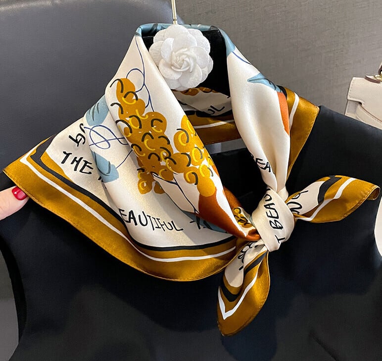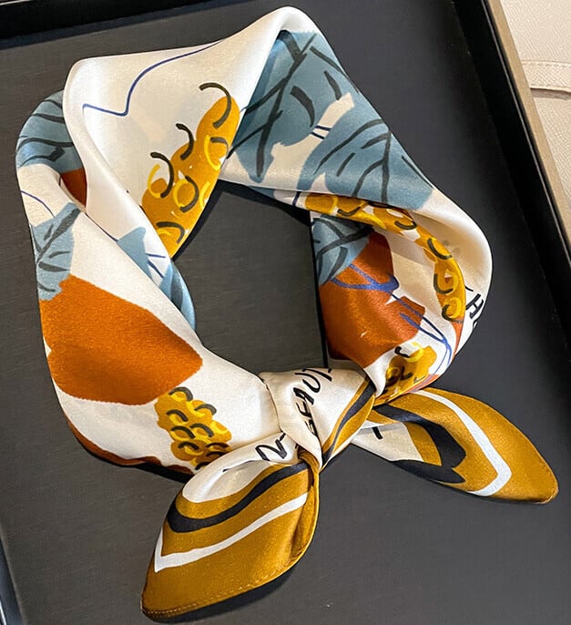 首元だけでなく髪や腕、カバンに巻いてもぴったりマッチするコンパクトなスカーフです。上質のシルク製なので光沢、柄の発色、肌触りも最高。